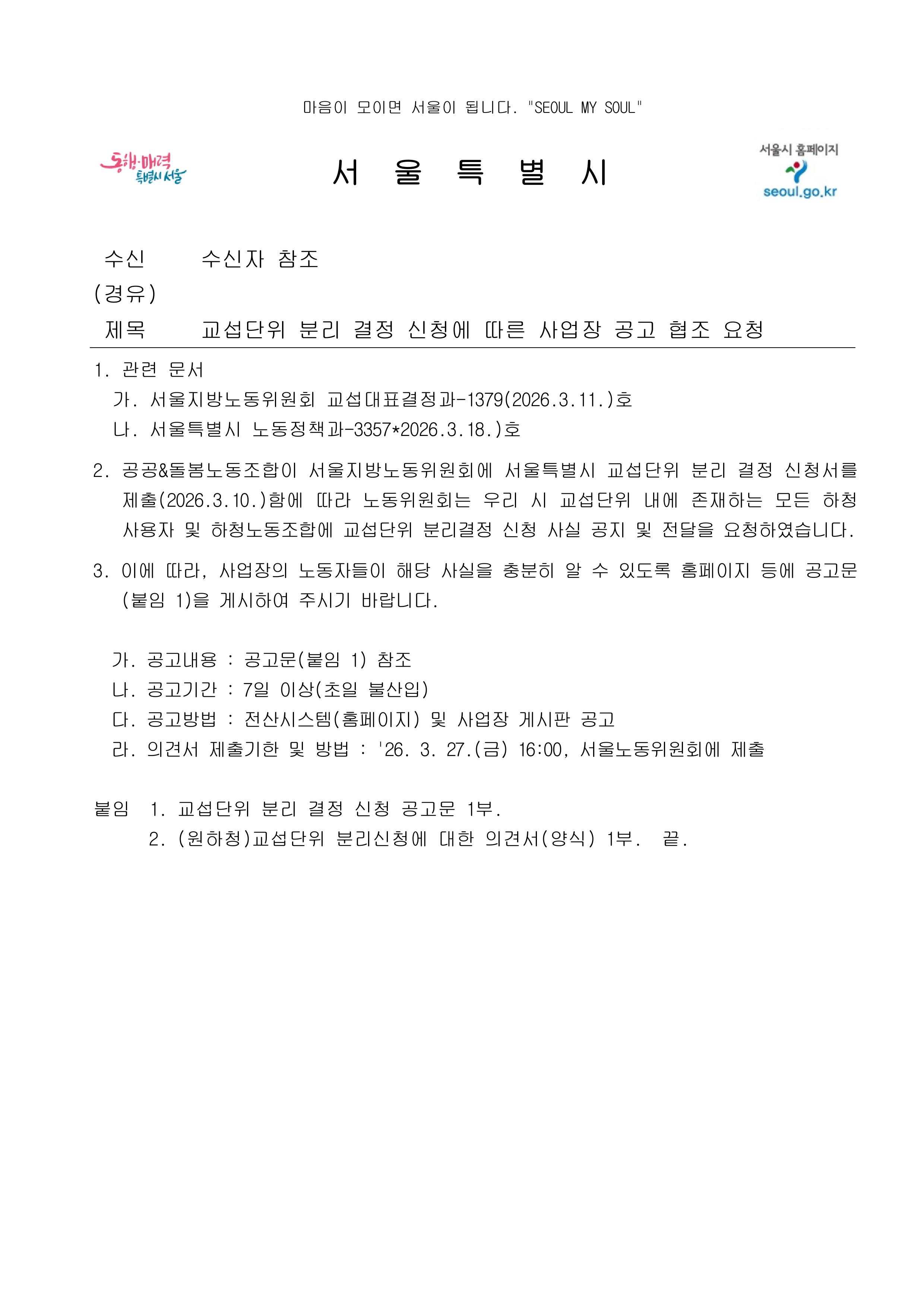 교섭단위 분리 결정 신청에 따른 사업장 공고 협조 요청
