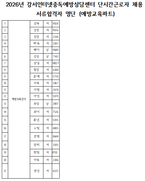 2026년 강서인터넷중독예방상담센터 단시간근로자 채용 서류합격자 명단(예방교육파트)