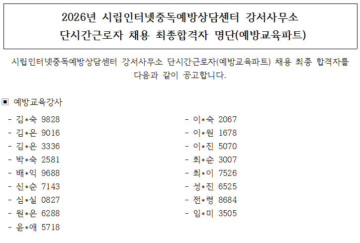 2026년 시립인터넷중독예방상담센터 강서사무소 단시간근로자 채용 최종합격자 명단(예방교육파트)