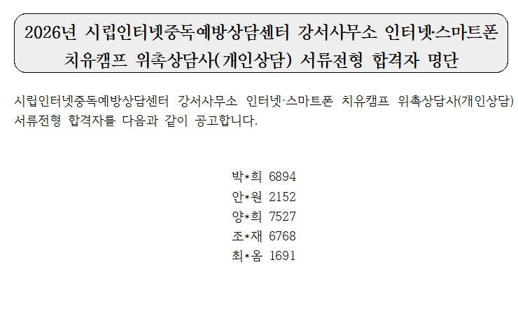 2026년 시립인터넷중독예방상담센터 강서사무소 인터넷‧스마트폰 치유캠프 위촉상담사(개인상담) 서류전형 합격자 명단