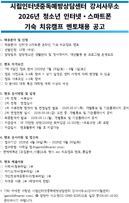 | 2026년 시립인터넷중독예방상담센터 강서사무소 인터넷‧스마트폰 치유캠프 멘토모집 | |||||